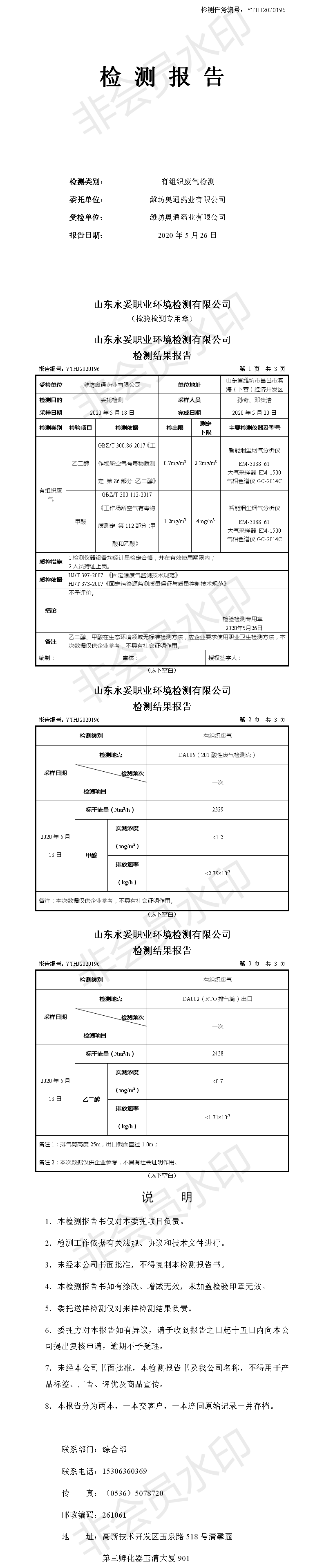 濰坊奧通藥業(yè)有限公司五月環(huán)境檢測報(bào)告