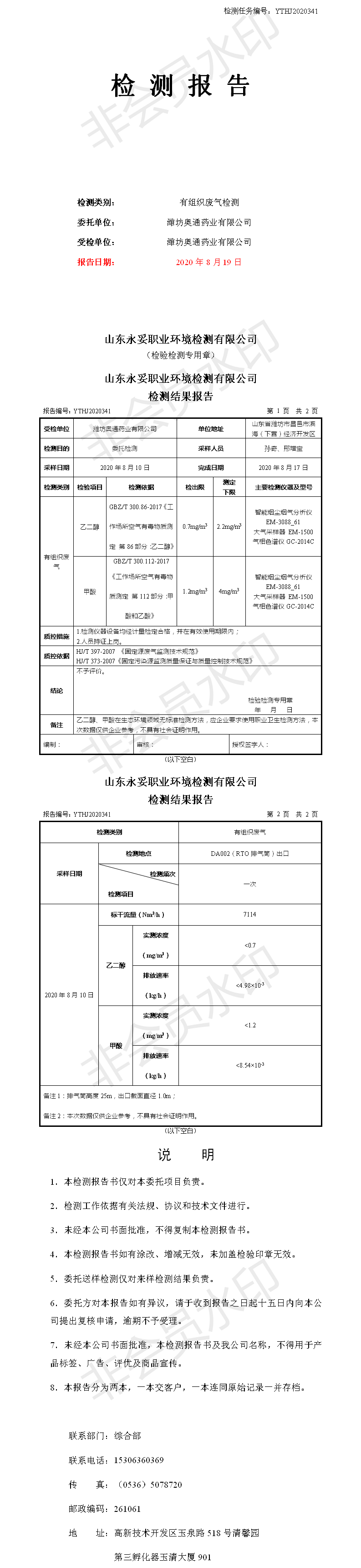 濰坊奧通藥業(yè)有限公司八月環(huán)境檢測(cè)報(bào)告