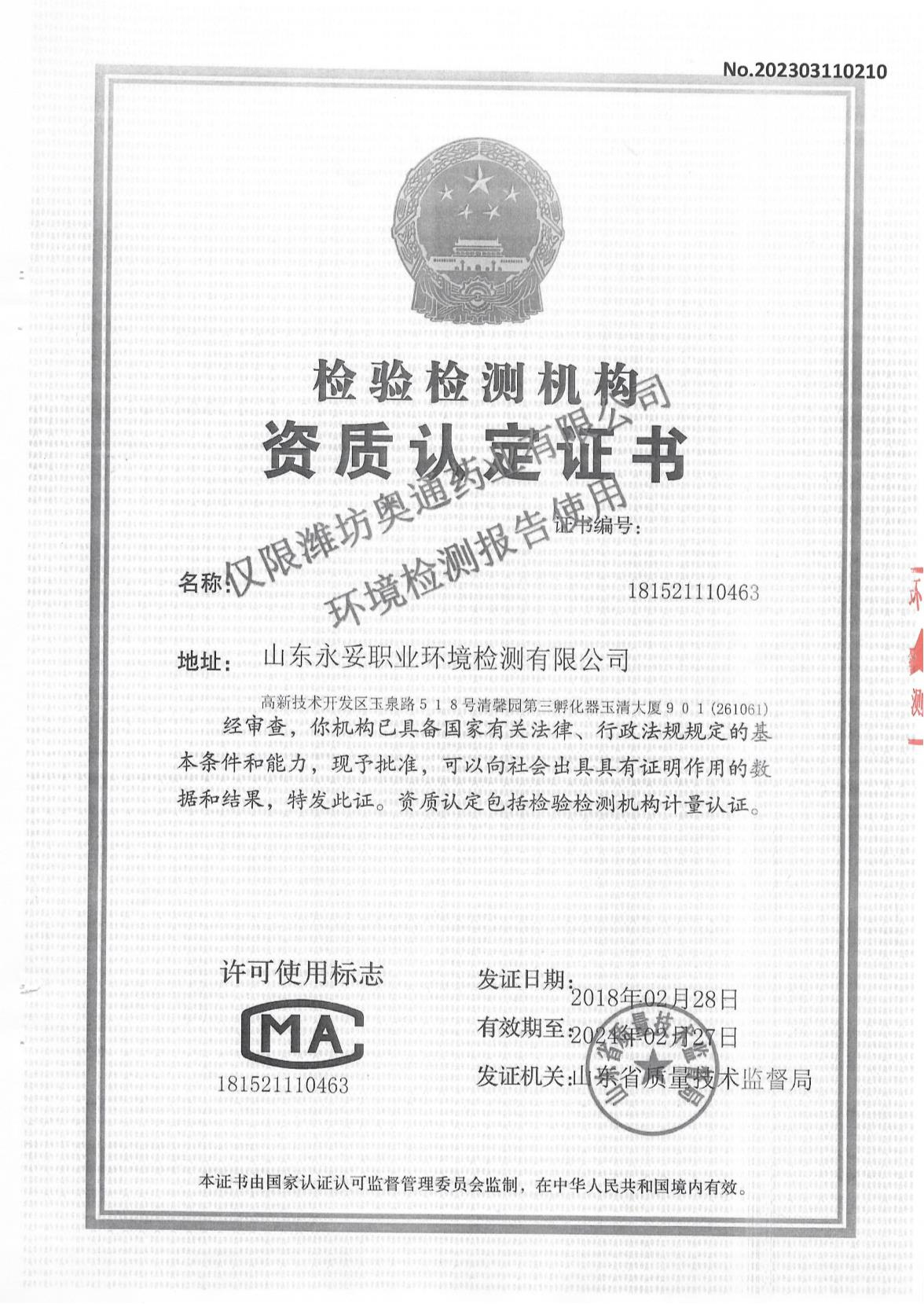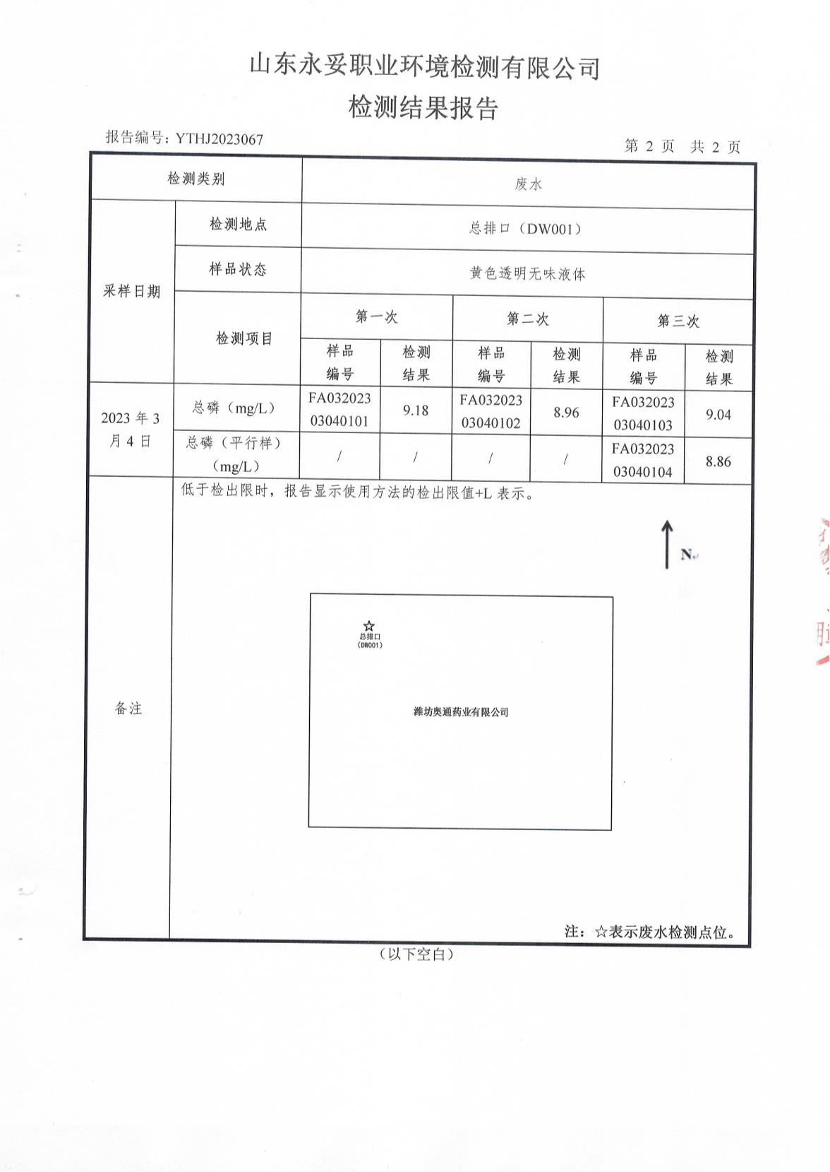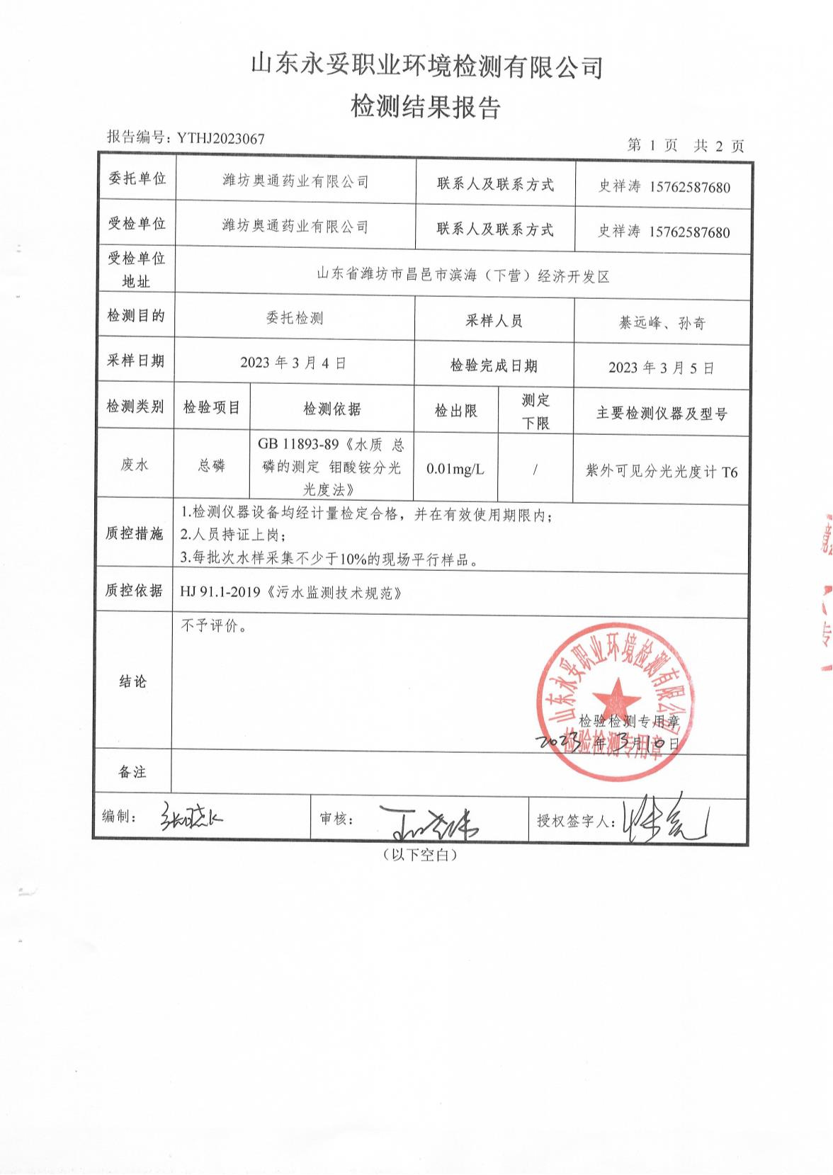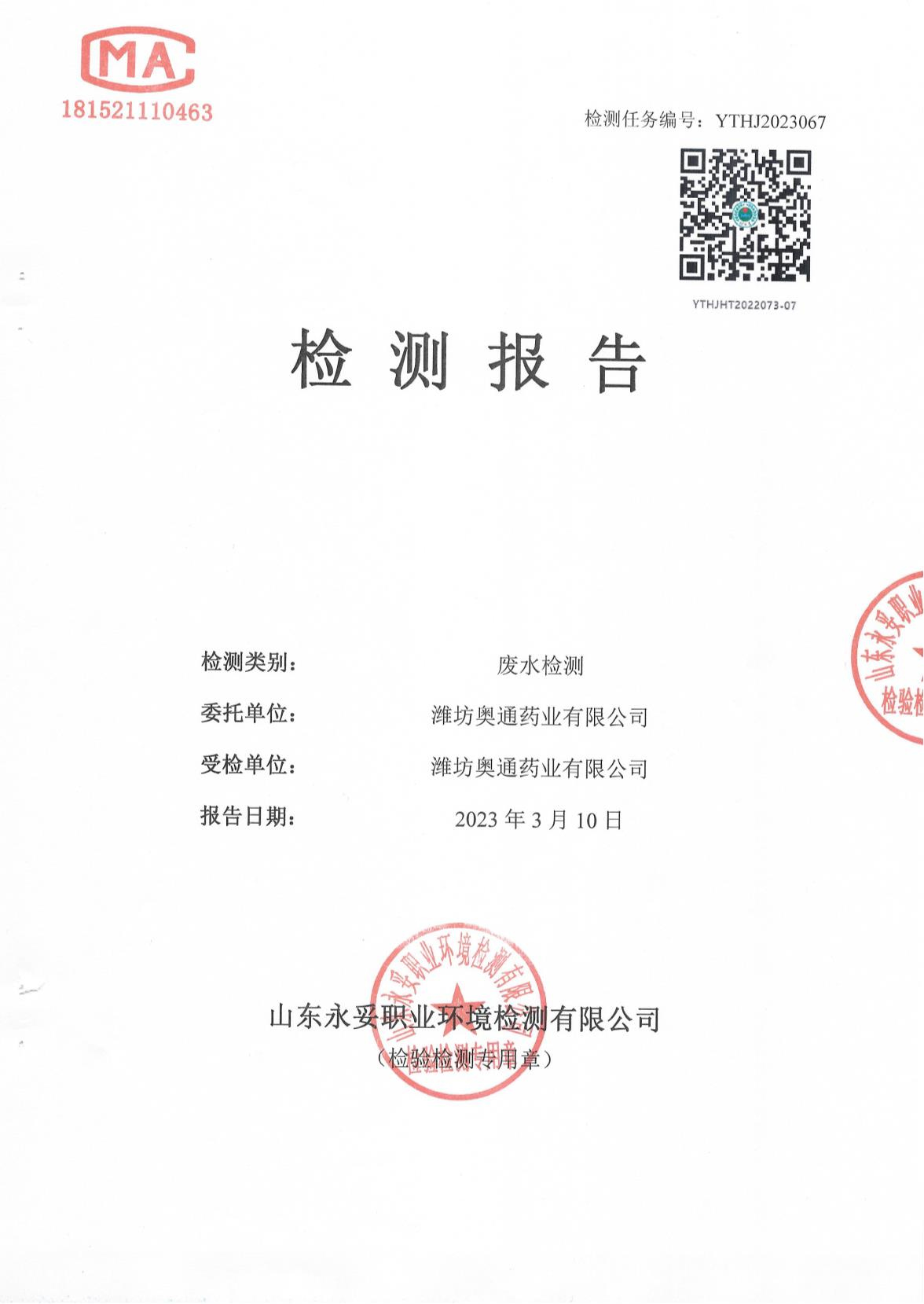 濰坊奧通藥業(yè)有限公司三月環(huán)境檢測報告